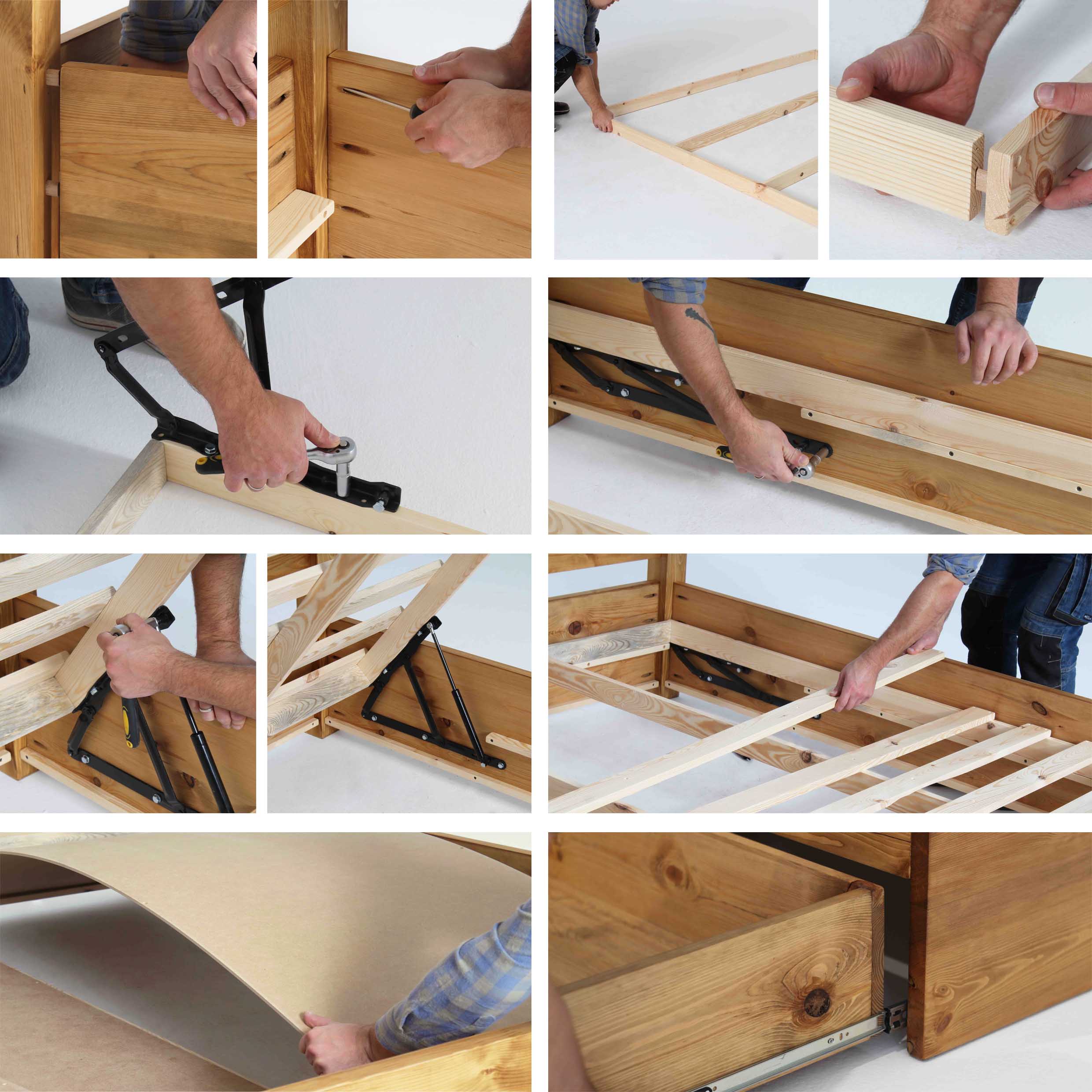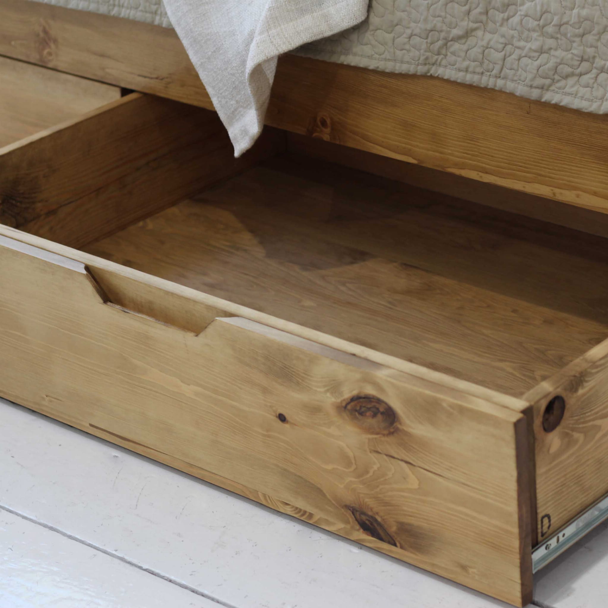 Fronty szuflad mają wygodne, frezowane uchwyty i są wykonane z tego samego masywnego drewna co rama, dzięki czemu całość jest spójna i wizualnie „czysta”. Zależnie od rozmiaru łóżka otrzymujesz: