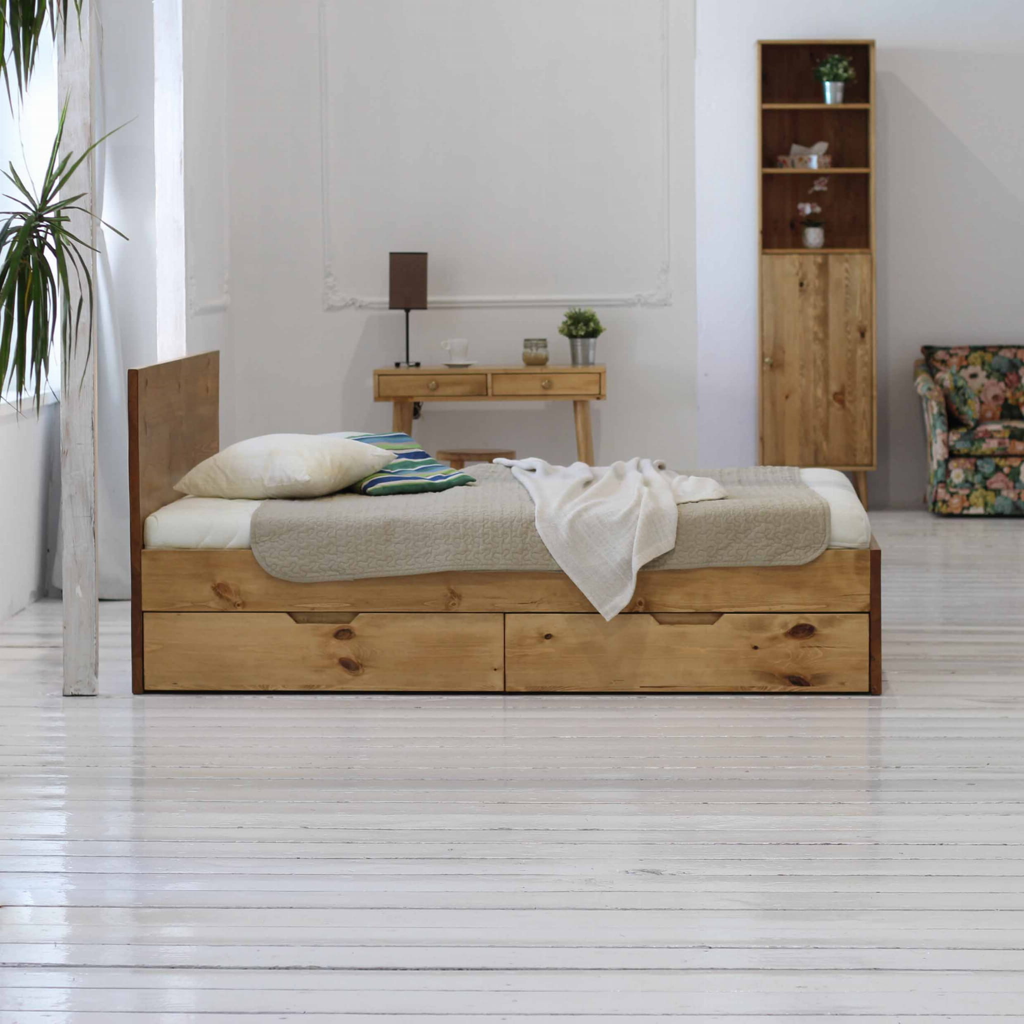 To proste, praktyczne i trwałe łóżko, które łączy naturalny materiał z funkcjonalną przestrzenią do przechowywania.